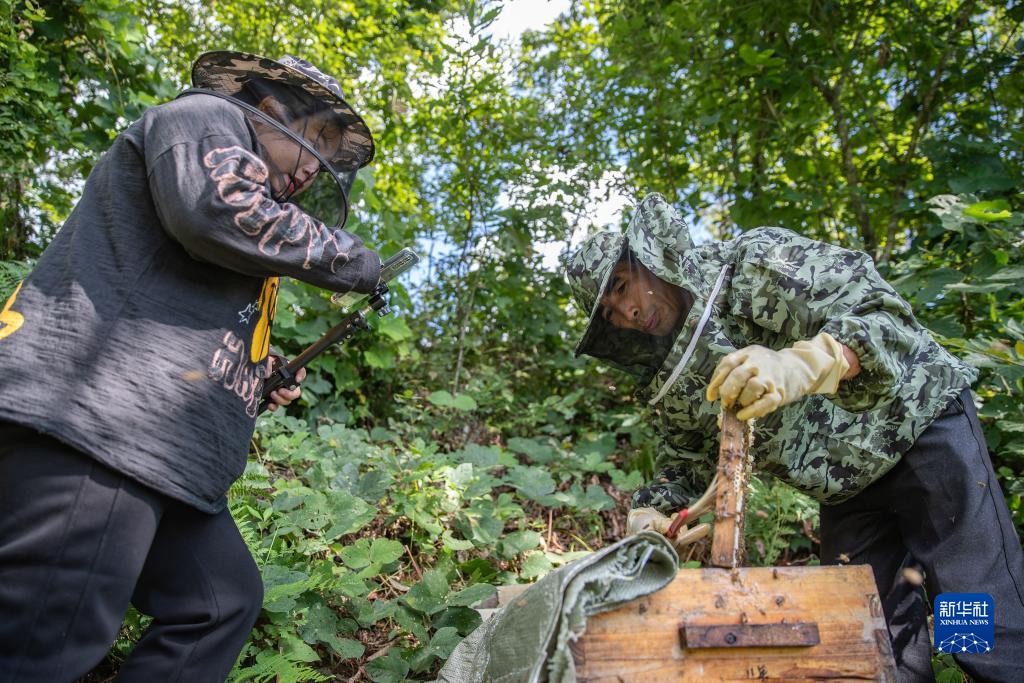 9月13日,在重慶市城口縣巴山鎮農民村,一名電商主播(左)在直播蜂農采收蜂蜜。新華社記者 黃偉 攝