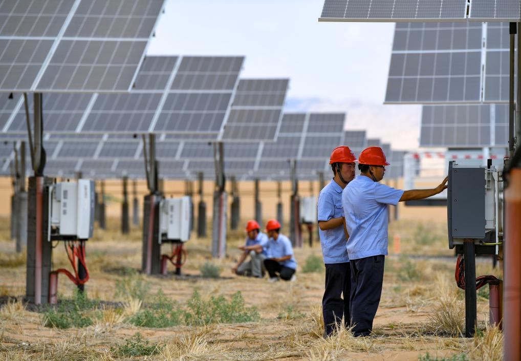 ↑ 8月9日,工作人員在寧夏騰格里沙漠新能源基地檢查逆變器。