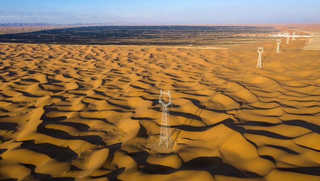 ↑ 位于寧夏中衛市的騰格里沙漠新能源基地和輸電線(xiàn)路。