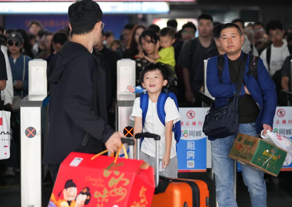 10月6日,剛抵達上?;疖?chē)站的旅客在準備出站。當日是中秋、國慶長(cháng)假的最后一天,全國各地迎來(lái)返程高峰。新華社記者 丁汀 攝