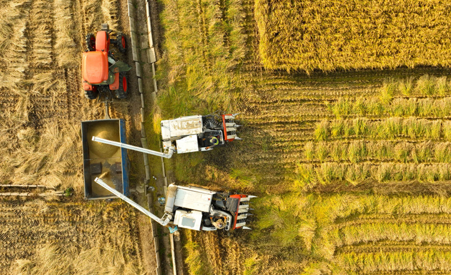 在遼寧省燈塔市東古城子村,水稻收割機將收割的水稻裝車(chē)(2023年10月12日攝,無(wú)人機照片)。新華社記者 楊青 攝