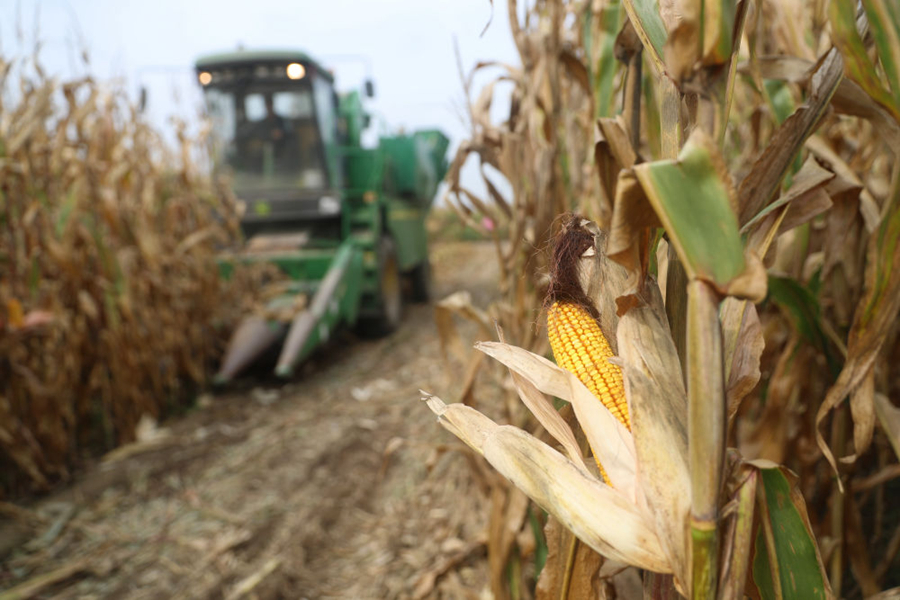 在遼寧省鐵嶺縣蔡牛鎮的玉米田里,農民駕駛農機收割玉米(2023年9月26日攝)。新華社記者 楊青 攝