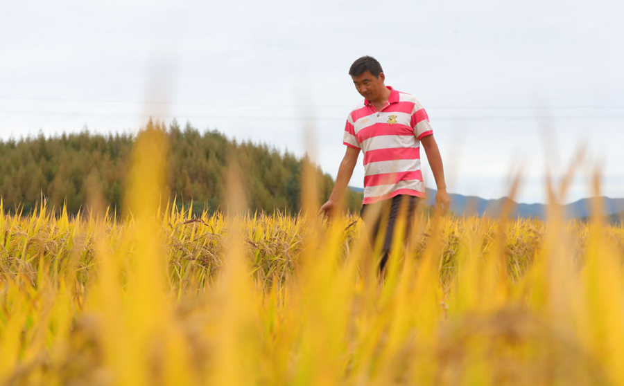 在遼寧省撫順市新賓滿(mǎn)族自治縣新賓鎮的稻田里,農民查看水稻成熟情況(2023年9月25日攝)。新華社記者 楊青 攝