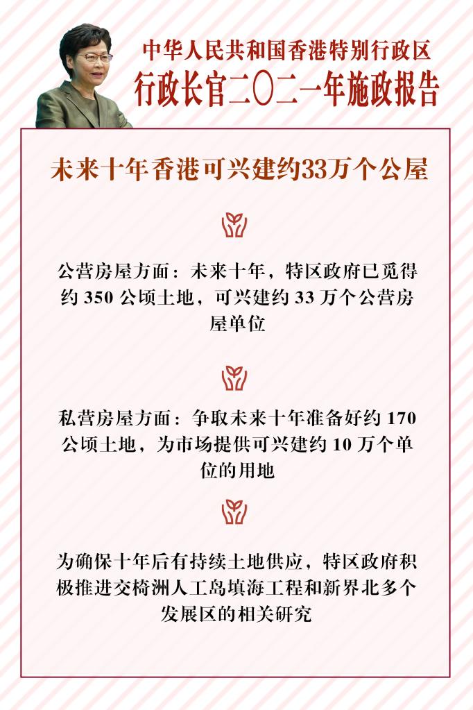 私營(yíng)房屋方面,林鄭月娥說(shuō),特區政府爭取未來(lái)十年準備好約170公頃土地,提供可興建約10萬(wàn)個(gè)單位的用地。她表示,為確保十年后有持續土地供應,特區政府正積極推進(jìn)交椅洲人工島填海工程和新界北多個(gè)發(fā)展區的相關(guān)研究,并建議檢視“綠化地帶”的發(fā)展潛力。