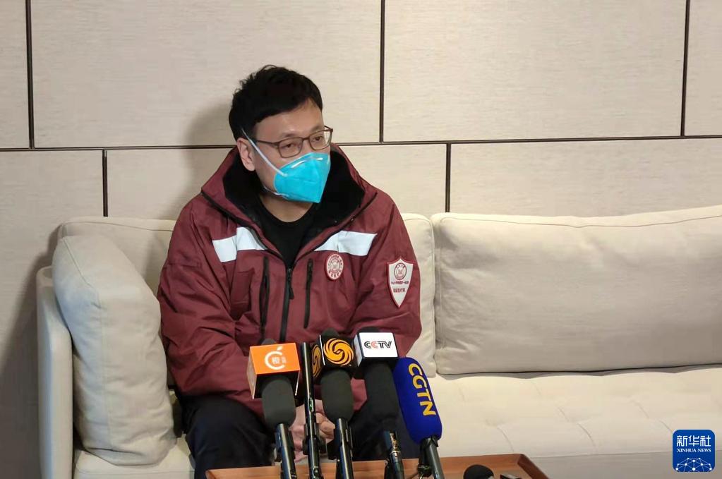 2月21日,第二批內地援港抗疫醫療防疫工作隊核酸采樣負責人、中山大學(xué)附屬第一醫院副院長(cháng)張弩在香港接受采訪(fǎng),介紹醫療隊核酸采樣人員首日工作情況。新華社記者 查文曄 攝