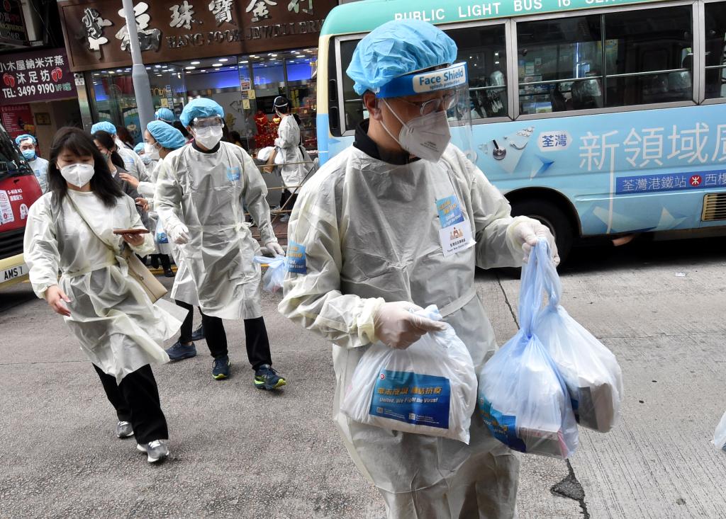 當天,行政長(cháng)官林鄭月娥在署理民政事務(wù)局局長(cháng)陳積志陪同下,到訪(fǎng)港島中西區一幢“三無(wú)大廈”(指無(wú)業(yè)主立案法團、其他業(yè)主組織及物業(yè)管理公司),逐家逐戶(hù)派發(fā)“防疫服務(wù)包”,并呼吁居民用好服務(wù)包內的快速抗原測試包,在4月8日至10日每天和家人一起做自我檢測,識別感染個(gè)案,盡早穩控疫情。