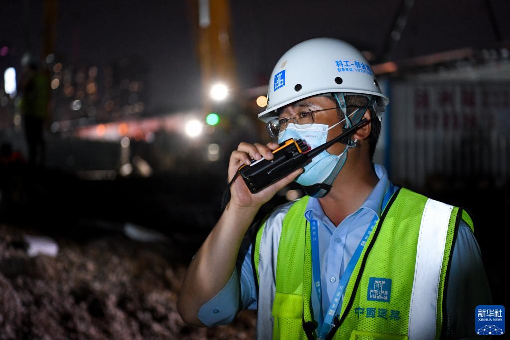 3月30日晚,一期醫院A2工區長(cháng)郭金池在施工現場(chǎng)用對講機溝通。新華社記者 梁旭 攝