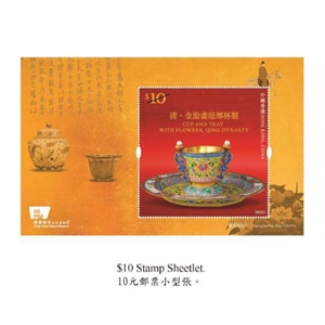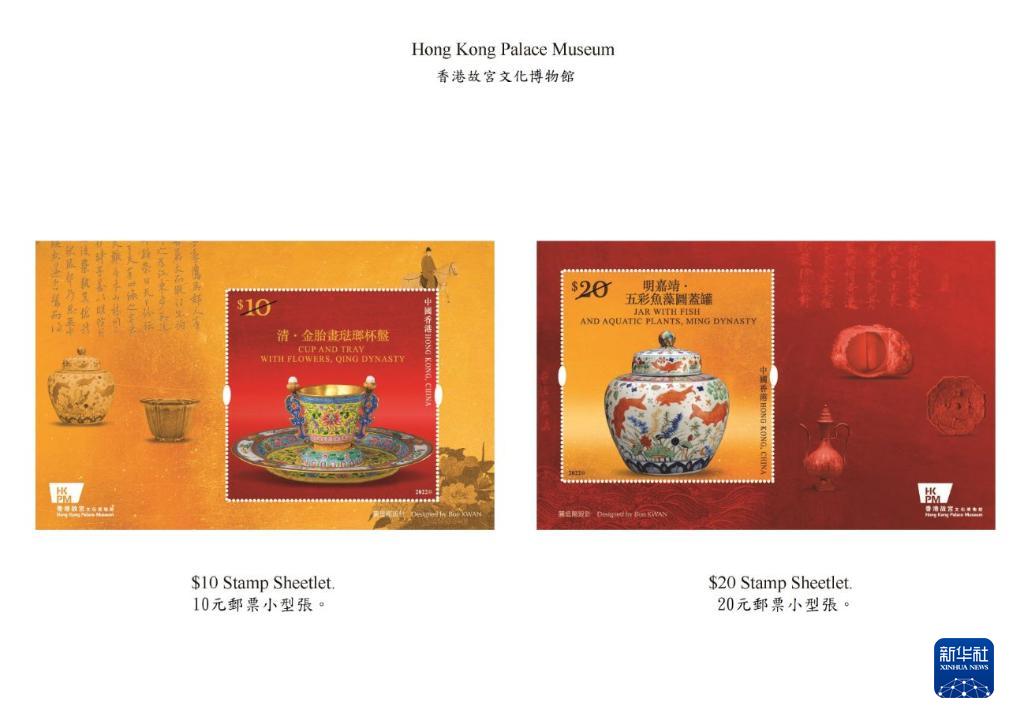 郵票小型張則分別展示清代《金胎畫(huà)琺瑯杯盤(pán)》和明嘉靖《五彩魚(yú)藻紋蓋罐》,并以金黃色及朱紅色互相襯托。