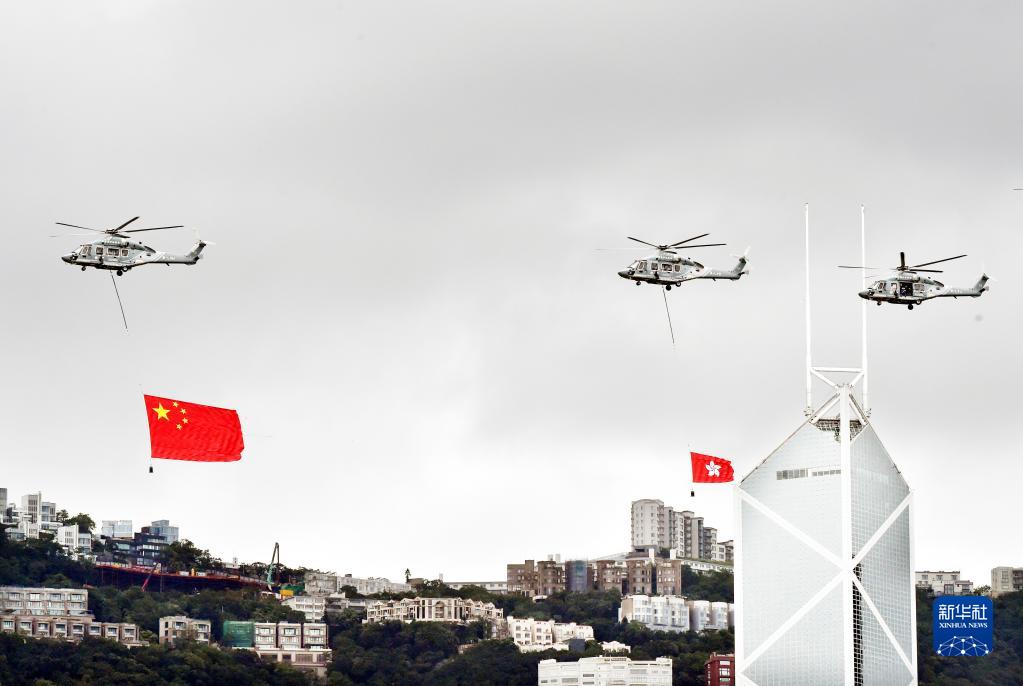 同時(shí),香港特區政府飛行服務(wù)隊的直升機隊在維多利亞港上空飛過(guò),領(lǐng)航直升機懸掛大幅國旗,區旗緊隨其后。海面上,香港紀律部隊消防輪噴灑水柱敬禮。
