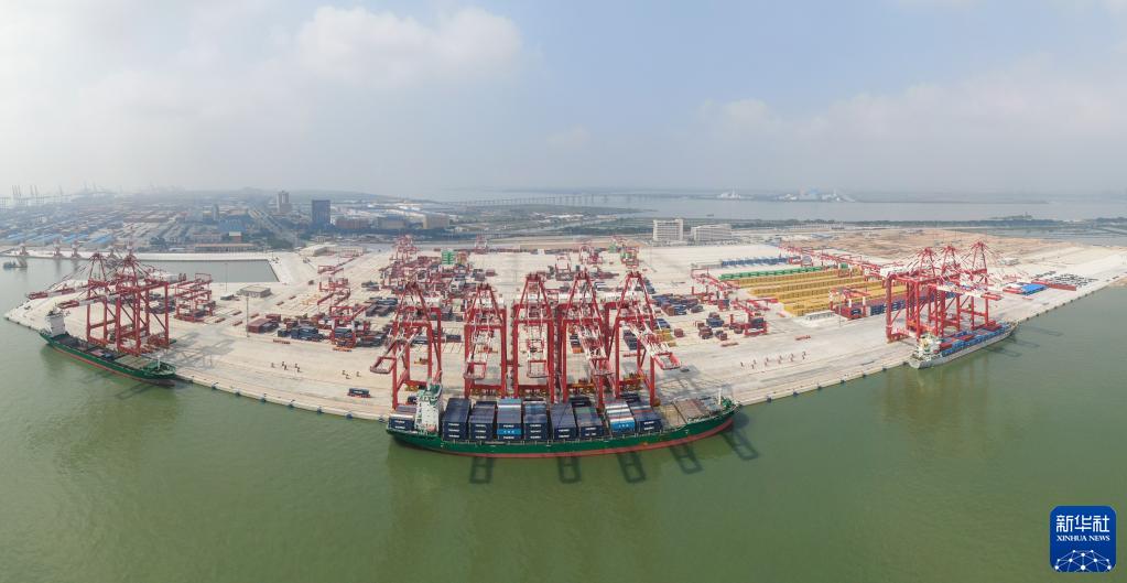 這是廣州港南沙港區四期全自動(dòng)化碼頭(2022年7月28日攝,無(wú)人機全景照片)。新華社記者 鄧華 攝