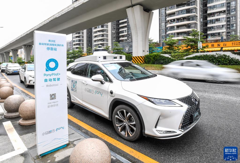 一輛由小馬智行運營(yíng)的自動(dòng)駕駛出租車(chē)在廣州南沙一個(gè)自動(dòng)駕駛??空镜却丝停?022年6月15日攝)。新華社記者 劉大偉 攝
