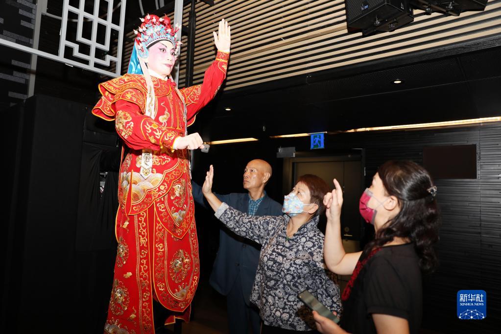 8月22日,創(chuàng )新粵劇《開(kāi)心穿粵》的兩位導演羅家英(左)和鐘珍珍(中)向記者介紹機器人。新華社記者 吳曉初 攝
