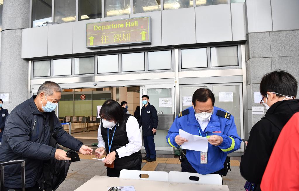 1月8日,香港工作人員在深圳灣口岸查驗旅客過(guò)關(guān)手續資料。新華社記者 陳鐸 攝