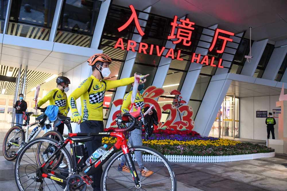 2月6日,來(lái)自香港的騎行愛(ài)好者從蓮塘/香園圍口岸入境深圳。新華社記者 毛思倩 攝