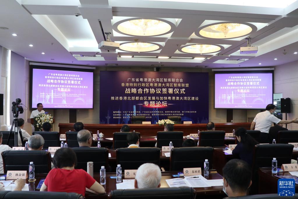 6月1日拍攝的廣東省粵港澳大灣區智庫聯(lián)合會(huì )與香港特別行政區粵港澳大灣區智庫聯(lián)盟戰略合作協(xié)議簽署儀式現場(chǎng)。新華社記者 洪澤華 攝