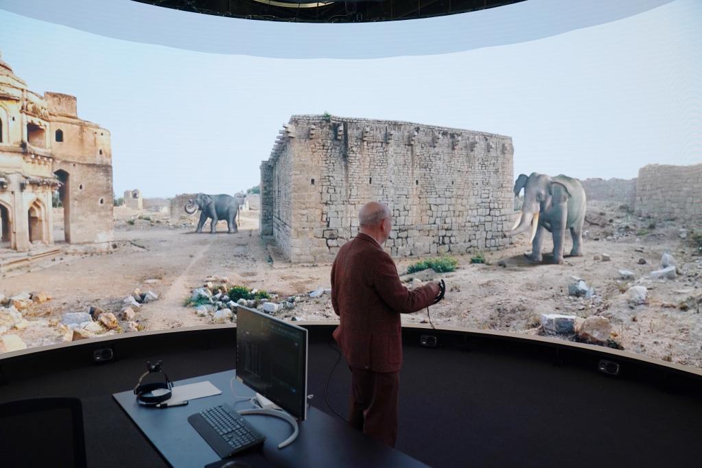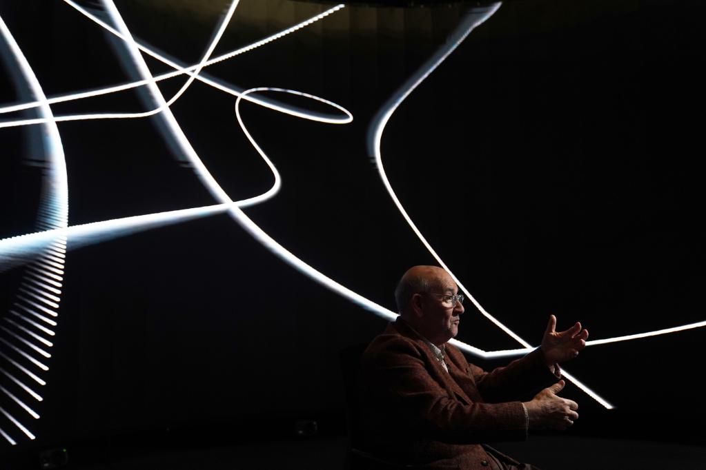 在香港浸會(huì )大學(xué)視覺(jué)化研究中心,香港浸會(huì )大學(xué)視覺(jué)藝術(shù)院講座教授、藝術(shù)家邵志飛在配備有傳感器和生物識別技術(shù)的全景影院中展示作品(5月11日攝)。新華社記者 王申 攝