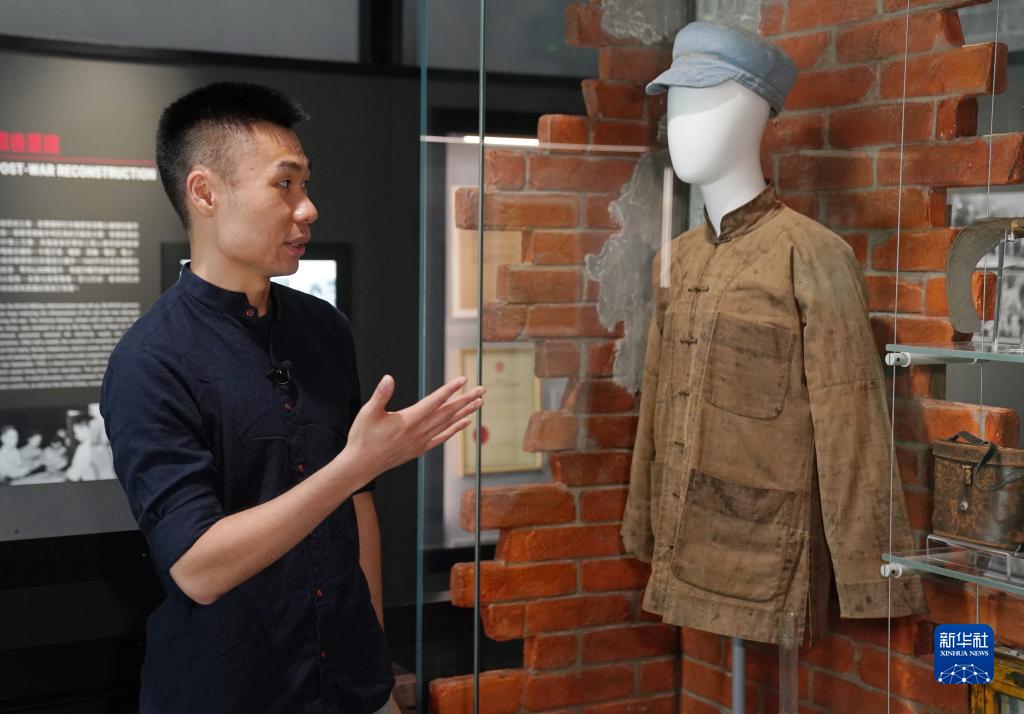 香港海防博物館二級助理館長(cháng)楊汶翹向新華社記者介紹博物館展廳中東江縱隊港九獨立大隊成員抗戰時(shí)的穿戴裝束(8月24日攝)。 新華社記者 王申 攝