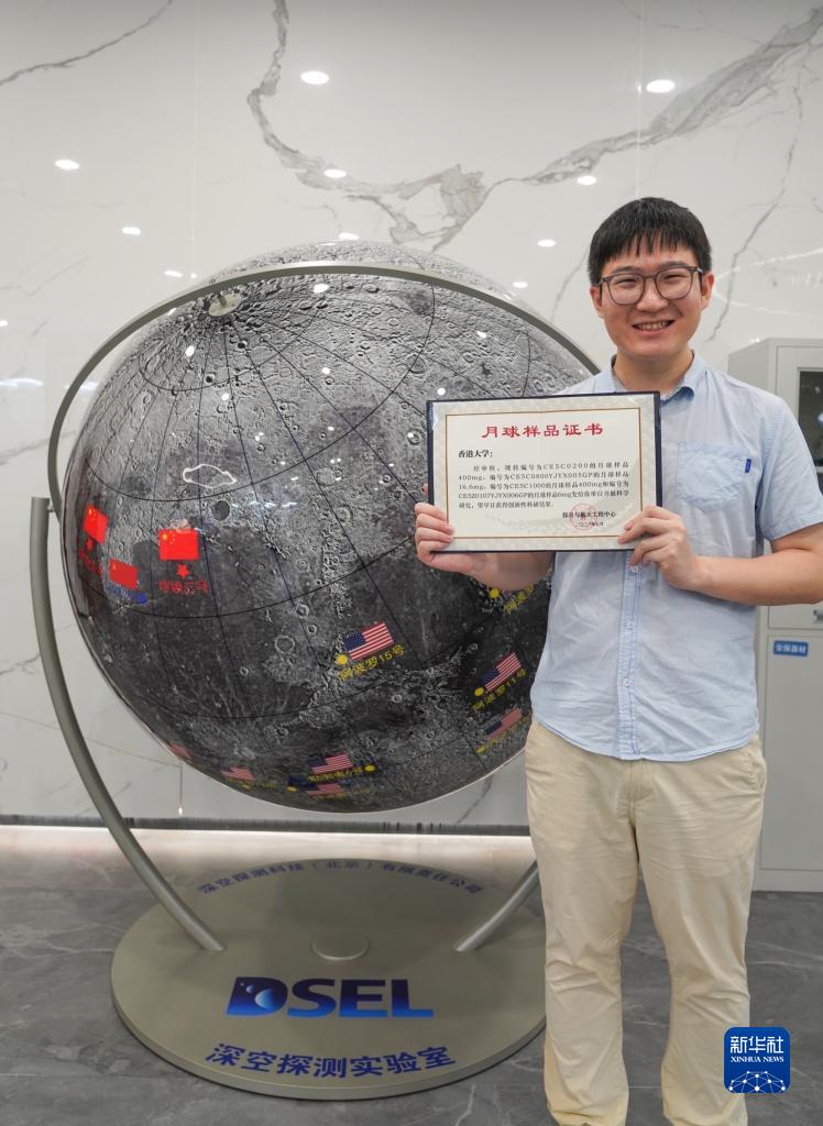 香港大學(xué)地球科學(xué)系博士后研究員錢(qián)煜奇到北京領(lǐng)取月球樣品后手拿證書(shū)拍照(7月31日攝)。新華社發(fā)