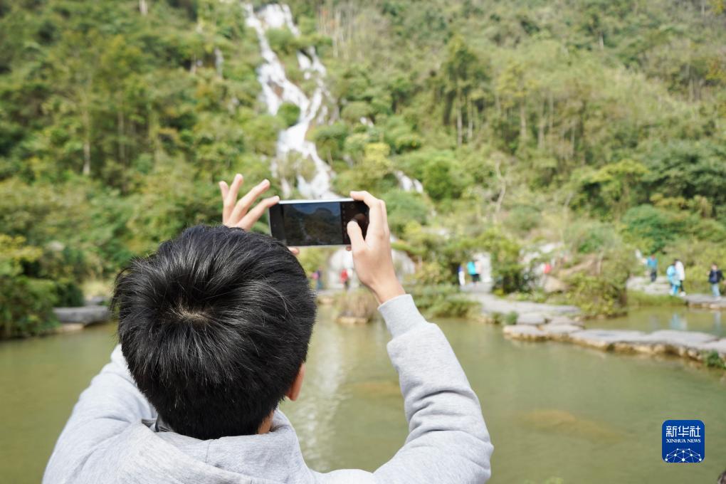 11月19日,香港筲箕灣官立中學(xué)學(xué)生在貴州荔波小七孔景區內拍照。新華社記者 駱飛 攝