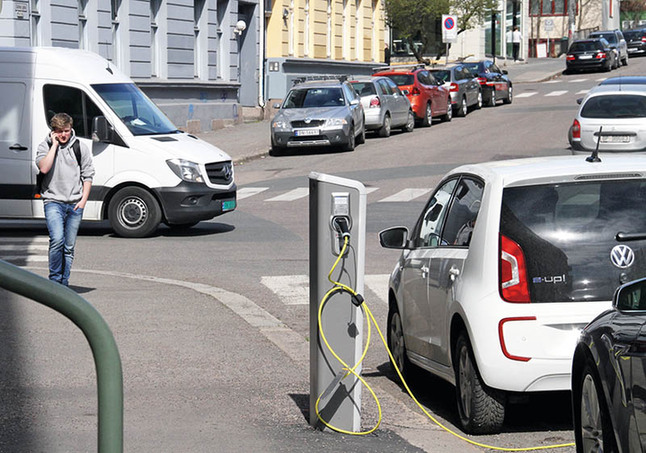 在挪威首都奧斯陸,一輛電動(dòng)汽車(chē)在路邊停放并充電