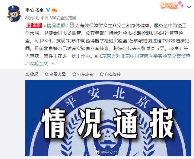 為有效保障群眾生命安全和身體健康,服務(wù)全市防疫工作大局,衛健會(huì )同市場(chǎng)監管、公安等部門(mén)持續對全市核酸檢測機構進(jìn)行督查檢查。5月28日,發(fā)現“北京中同藍博醫學(xué)檢驗實(shí)驗室”在核酸檢測過(guò)程中涉嫌違法犯罪。目前北京警方已對該實(shí)驗室立案偵查,將法定代表人張某某(男,52歲)等人查獲,案件正在進(jìn)一步工作中。