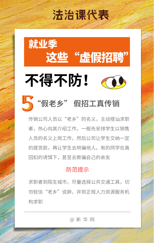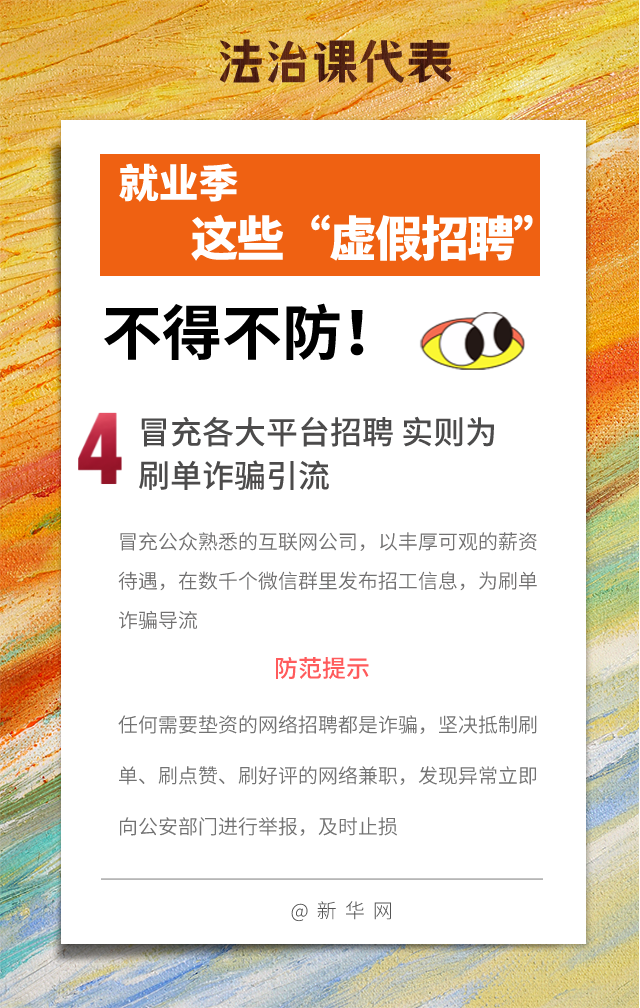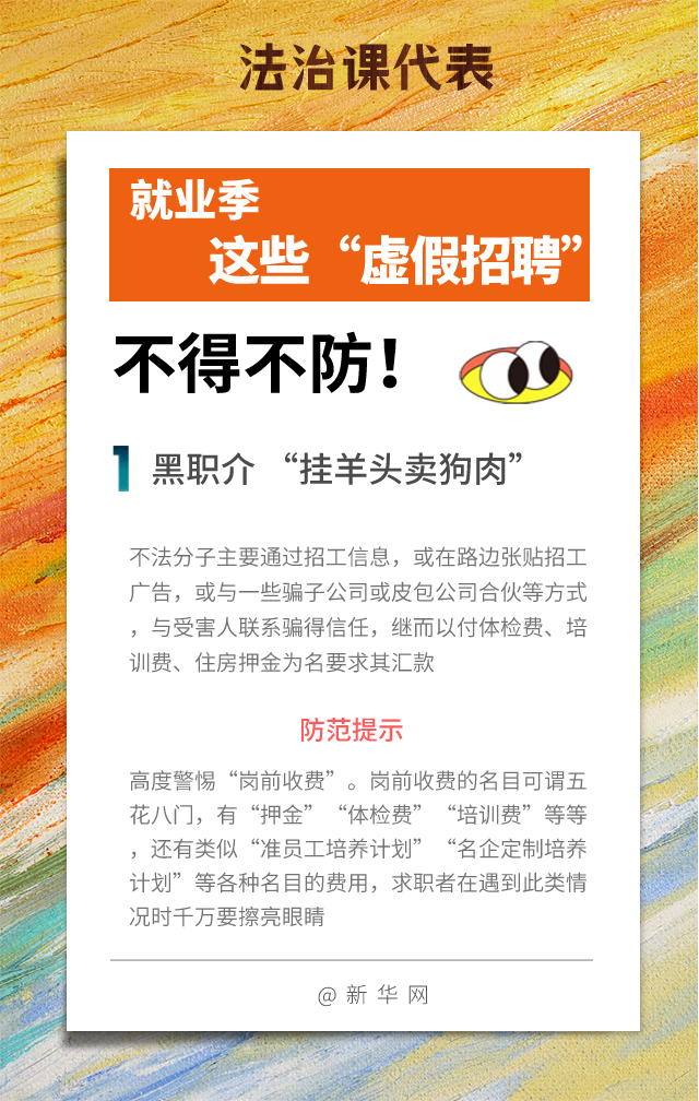 近日,人力資源和社會(huì )保障部會(huì )同國家市場(chǎng)監督管理總局發(fā)布通知,部署開(kāi)展為期兩個(gè)月的清理整頓人力資源市場(chǎng)秩序專(zhuān)項行動(dòng),通知明確要以打擊虛假招聘等為重點(diǎn)。以下為幾種常見(jiàn)的“虛假招聘”套路,大家一定要注意防范!