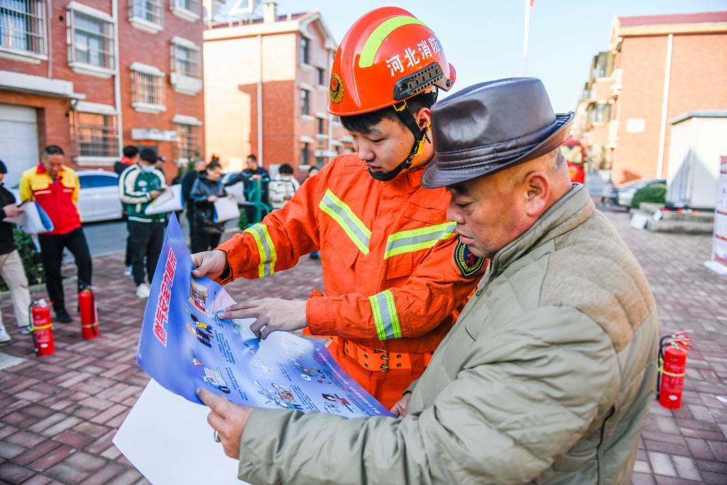 11月8日,在河北省遵化市西三里鎮一社區,消防救援人員向村民普及消防知識。新華社發(fā)(劉滿(mǎn)倉 攝)