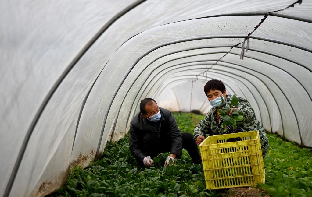 1月7日,西唐寨村村民陳彩俠(右)和愛(ài)人在自家菜地收菜。新華社記者劉瀟攝