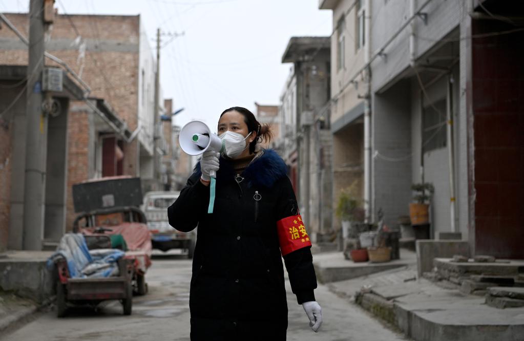 1月7日,西唐寨村志愿者在呼喊防疫提醒。新華社記者劉瀟攝