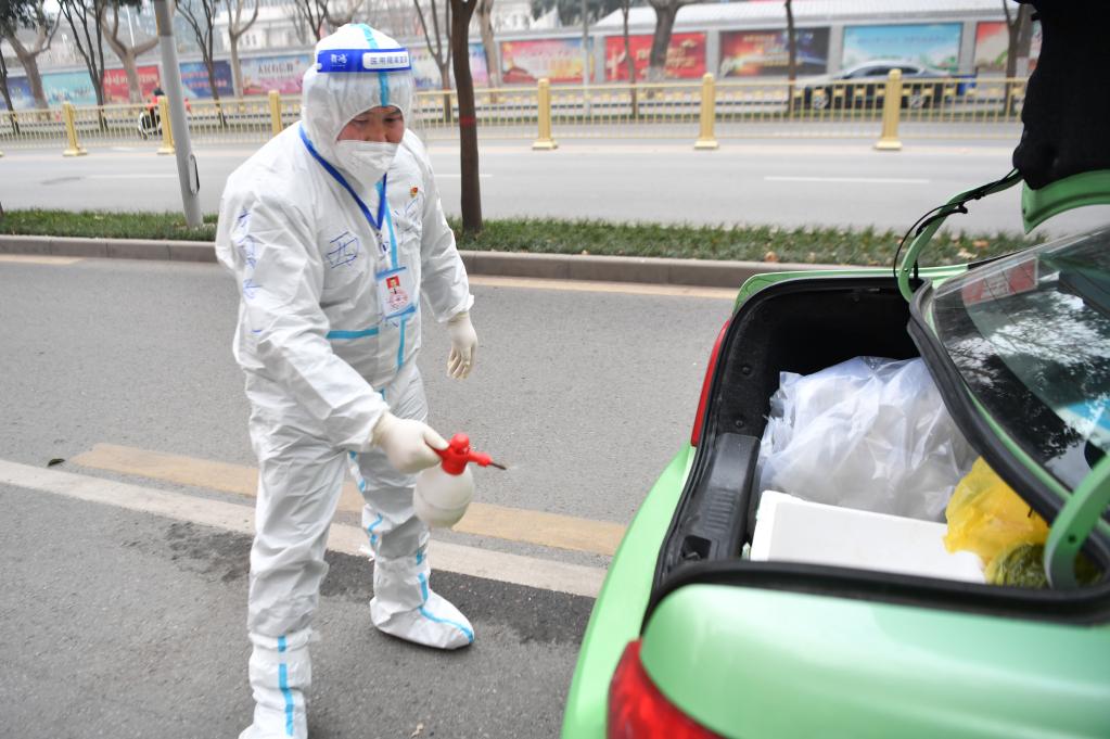 1月5日,西安“的哥”王鋒利在出發(fā)轉運核酸檢測樣本前為車(chē)輛消毒。新華社記者 張博文 攝