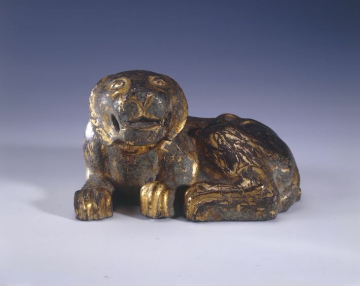 中日攜手舉辦的虎年展覽上,還有另一件“虎頭虎腦”的古代“文創(chuàng )”——西漢鎏金虎鎮。這同樣是一只臥虎,身上有虎斑花紋,虎頸處還戴著(zhù)一只“項圈”!與虎枕相比,這件虎鎮可謂分量十足,其中灌滿(mǎn)了鉛,重達3600克,使用起來(lái)極為穩固。
