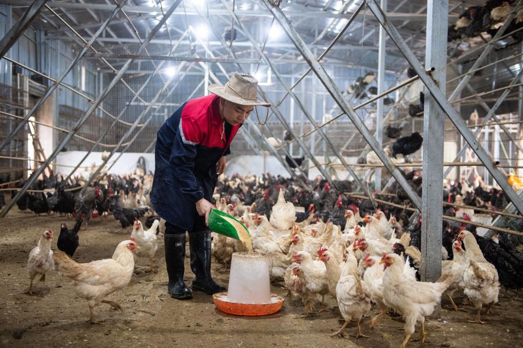 2月22日,在湖南省沅江市胭脂湖街道南竹山村,蔣連超在喂雞。新華社記者陳思汗 攝