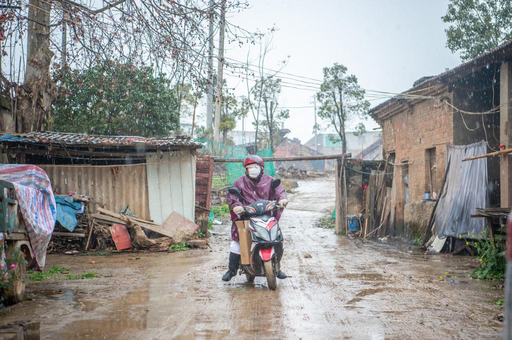 丁玉強騎摩托車(chē)到村民家中進(jìn)行健康檢查。新華社記者伍志尊 攝