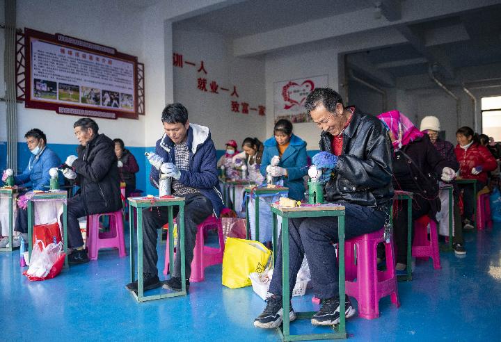 會(huì )澤縣縣城易地搬遷安置區群眾在棒球車(chē)間縫制棒球。(新華社記者 陳欣波 3月4日攝)