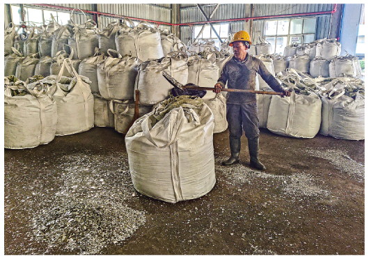▲湖南省花垣縣一礦業(yè)公司內,工人正在打包電解錳。 本報記者李黔渝攝