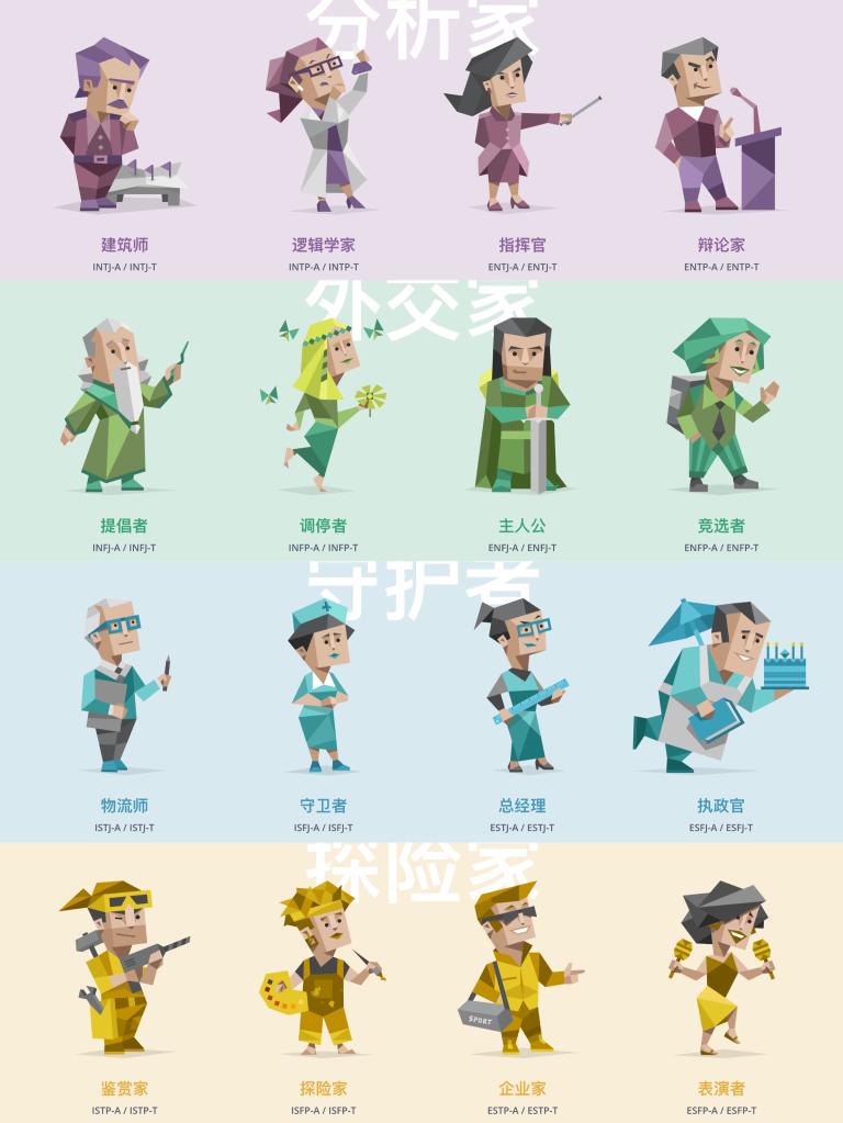 邁爾斯和布里格斯又在此基礎上增加了一個(gè)維度:“判斷(J)-知覺(jué)(P)”,構成了16種類(lèi)型,每種類(lèi)型都用4個(gè)字母表示,比如INTJ或ENFP。