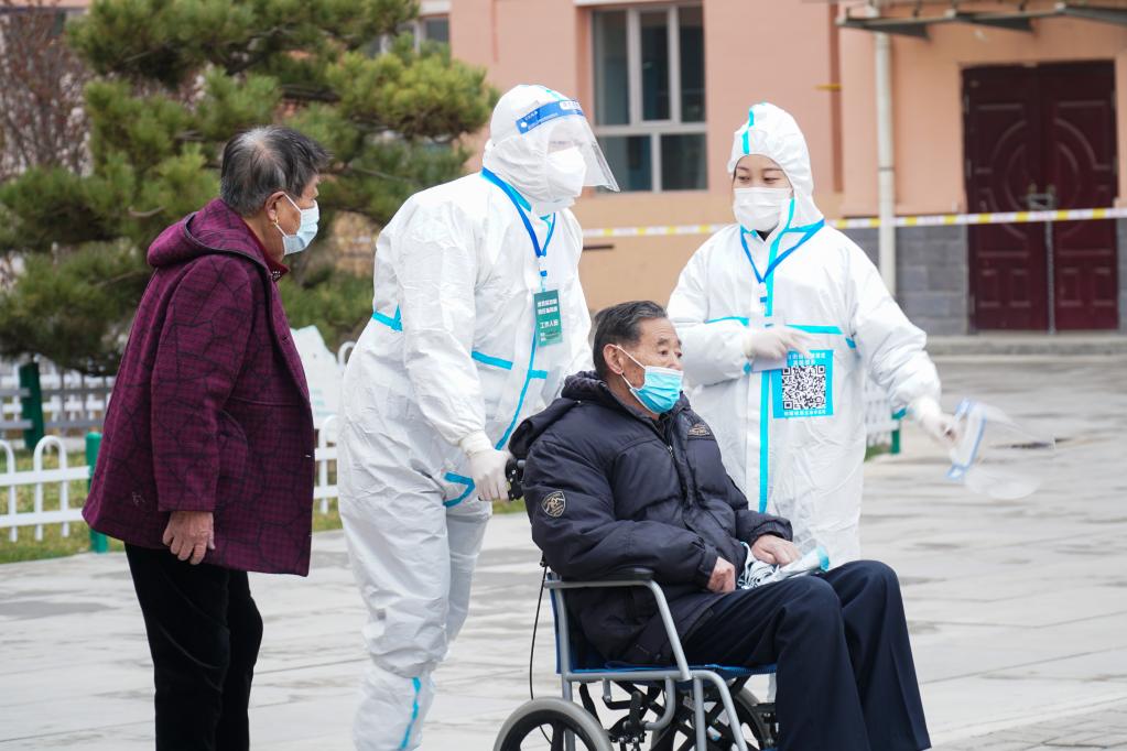 4月15日,在青海省西寧市城西區一處核酸檢測采樣點(diǎn),防疫工作人員為行動(dòng)不便的老人開(kāi)通“綠色通道”,方便他們完成核酸采樣。(新華社記者 張子琪 攝)