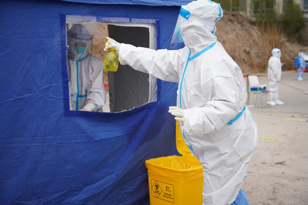 4月15日,在青海省西寧市城西區一處核酸采集點(diǎn),防疫人員正在做消殺。(新華社記者 張子琪 攝)