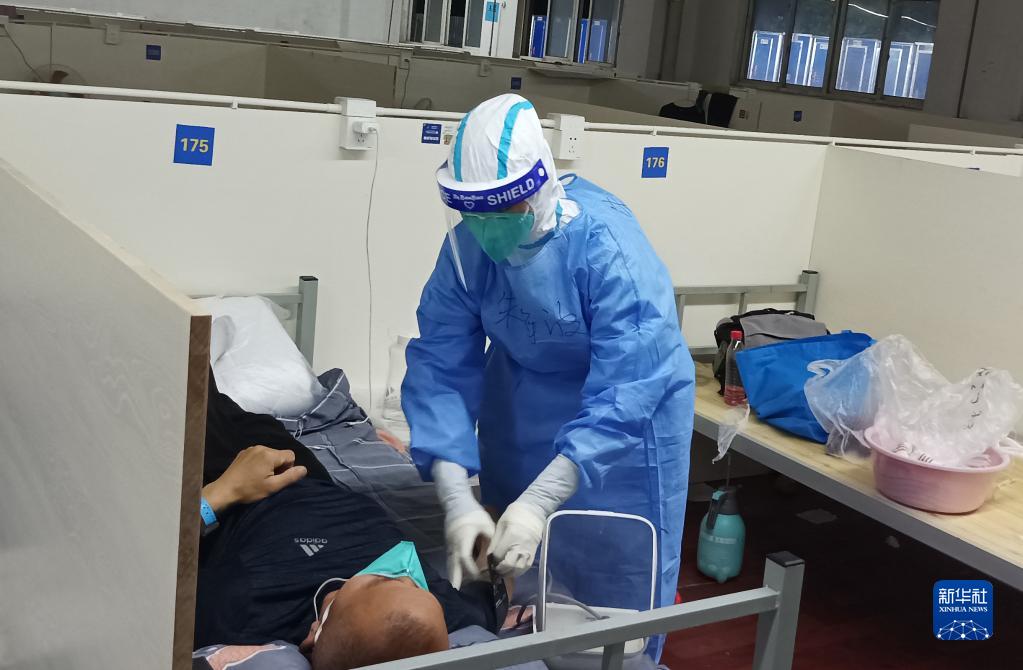 在上海市嘉定區南翔方艙醫院,海南省三亞市婦幼保健院ICU護士朱海波在照顧患者(5月12日攝)。新華社發(fā)(受訪(fǎng)者提供)