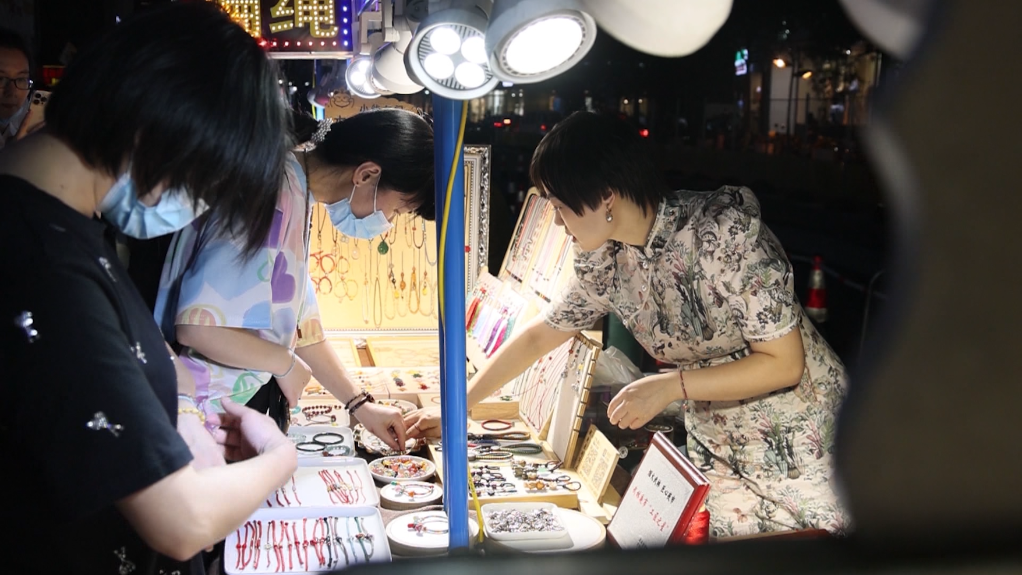 9日晚上7點(diǎn)左右,距杭州西子湖畔約500米的龍游路上,武林夜市熙熙攘攘。沿著(zhù)夜市的一端向前走,一長(cháng)排攤位上,擺滿(mǎn)了小飾品、扇子、編繩、手工玩偶等物件,燒烤味、水果味、花香味撲面而來(lái),熱鬧而有滋有味的杭城夜生活拉開(kāi)了帷幕。