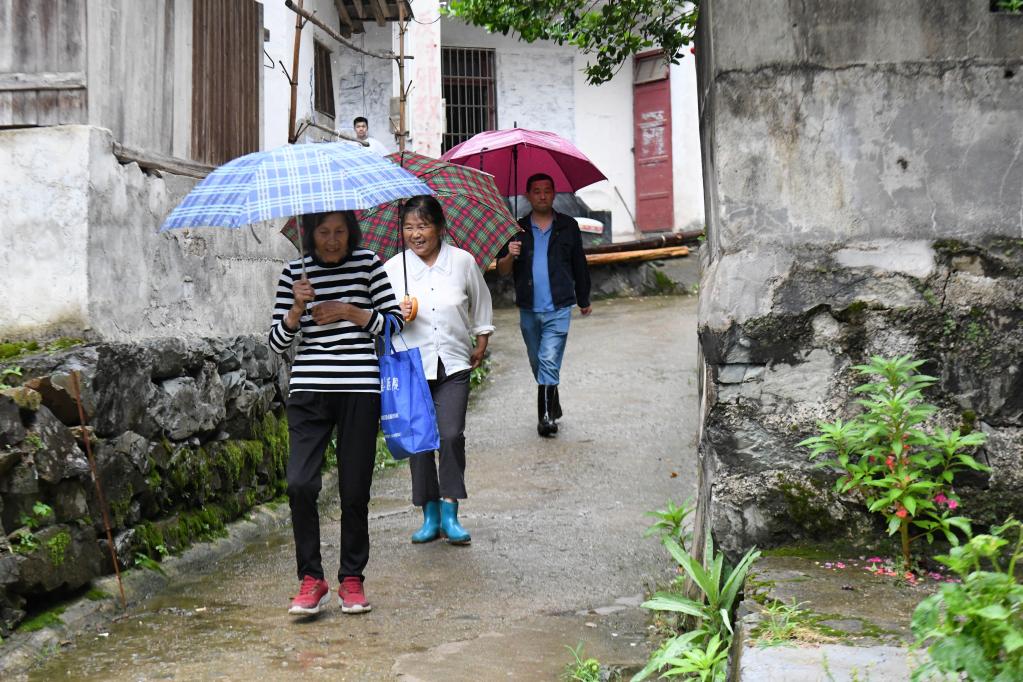19日下午,天空淅淅瀝瀝下著(zhù)小雨,在安徽省黃山市徽州區呈坎鎮容溪村,村民胡愛(ài)萍和鄰居一起冒雨走出家門(mén),坐上鎮政府安排的汽車(chē),前往楊干集中安置區。