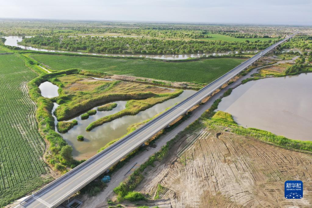 尉犁至且末沙漠公路穿越塔里木河和胡楊林(6月22日攝,無(wú)人機照片)。新華社記者 李響 攝