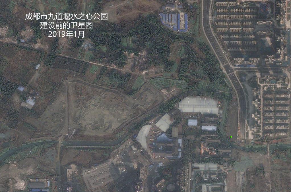 作為沱江流域成都段治理模式的范例,九道堰河流域被確定為生態(tài)文明建設主題公園。上圖為公園建設之前的衛星圖和實(shí)拍圖,建設前,這里雜草叢生,河道淤積,有的河段成為臭水溝。下圖為公園建設后的衛星圖和實(shí)拍圖。