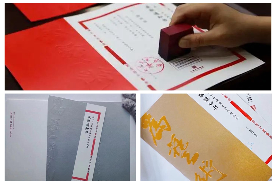 通知書(shū)在色彩上進(jìn)行區分,本科生錄取通知書(shū)為紅色,象征熱情與活力,碩士錄取通知書(shū)為銀色,象征智慧與創(chuàng )造。博士錄取通知書(shū)為金色,象征經(jīng)典與思索。