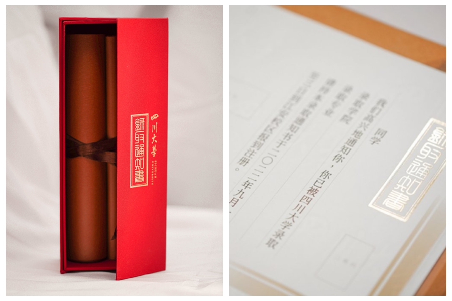 2022年四川大學(xué)錄取通知書(shū)以“錦鳳遞書(shū)”為設計概念,卷首錦鳳環(huán)繞?;?,銜來(lái)入蜀治學(xué)的喜訊。卷末海浪翻涌托舉校訓,彰顯“海納百川”的胸懷。褐金底色,不變的是歷史厚重底蘊,書(shū)卷巧思,展開(kāi)的是明日坦蕩新程。