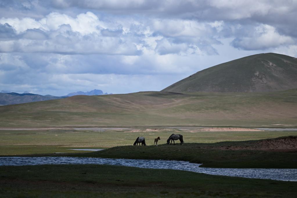 參賽馬匹在草場(chǎng)上吃草。新華社記者 張龍 攝