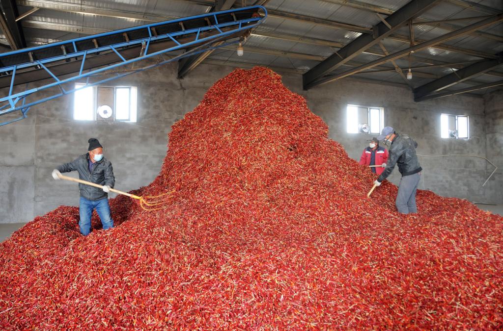 10月27日,工人在內蒙古巴彥淖爾市臨河區白腦包鎮一家辣椒加工廠(chǎng)篩選辣椒。新華社記者 李云平 攝