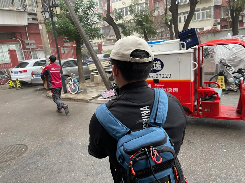 快遞小哥欒玉帥抱著(zhù)快遞健步如飛,記者趕忙追上前去。新華社記者 陳旭 攝