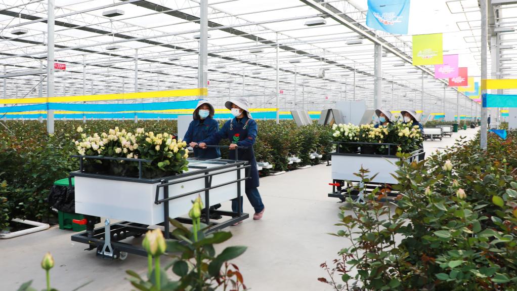 在位于甘肅省臨夏市的百益億農國際鮮花港,工人們正在搬運剛剛采摘的玫瑰。(受訪(fǎng)單位供圖)