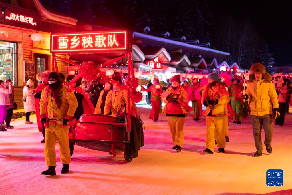 12月14日,秧歌隊在雪鄉景區內表演。新華社記者 謝劍飛 攝